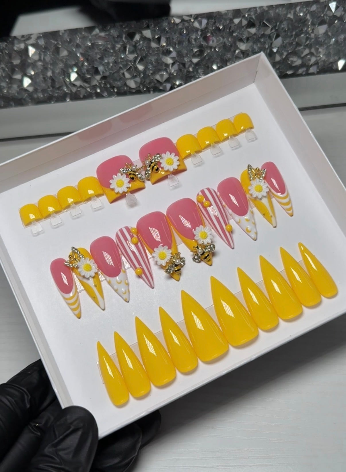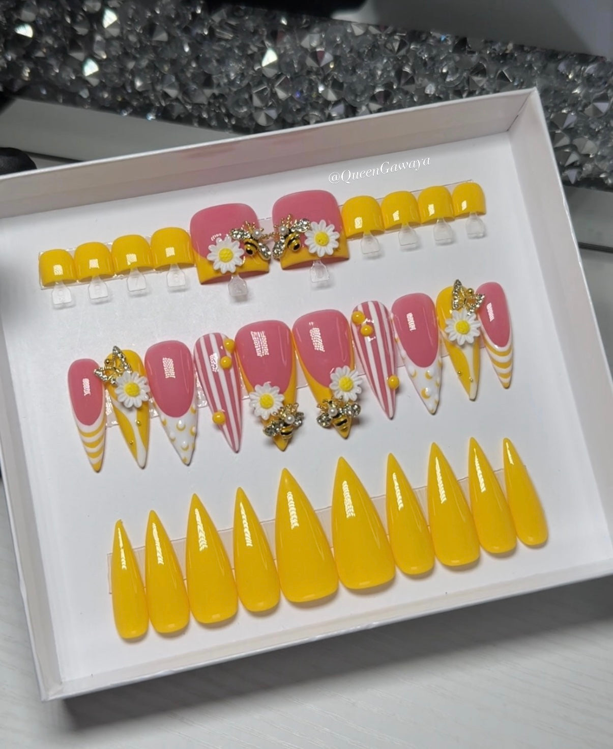 This bundle includes two full sets of XL stiletto press-on nails plus a 14-piece toe set, giving you a perfectly coordinated look from hands to toes. From glossy finishes to hand-placed charms, florals, and luxe accents, every detail is crafted to give you that rich, sunlit glow.