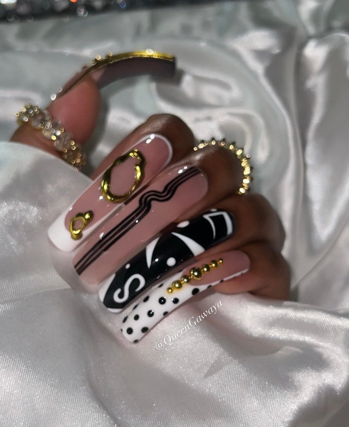 Step into luxury with Abstract — a bold blend of art and elegance. Featuring a flawless nude base enhanced with black-and-white contrast, gold embellishments, and geometric detailing, this set was made for statement-makers. Each nail tells its own story through linework, texture, and shine — creating a gallery-worthy finish right at your fingertips.