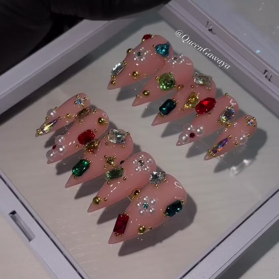 Turn every hand movement into a statement. Our Opulent Jewel Stiletto Press-On Nails feature a sheer nude base adorned with hand-placed multicolor gemstones, delicate pearls, and luxe gold detailing for a high-fashion, couture finish. Each nail is meticulously designed to give a rich, custom-set look that radiates elegance, confidence, and main-character energy.