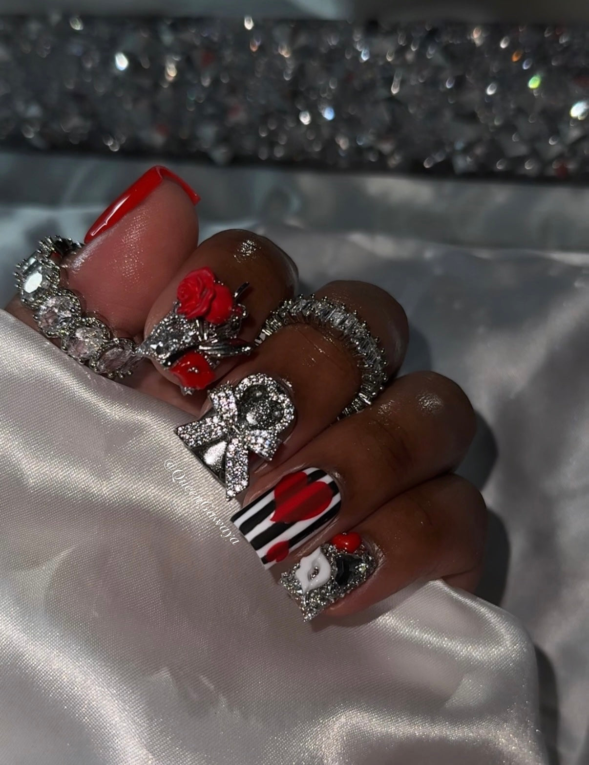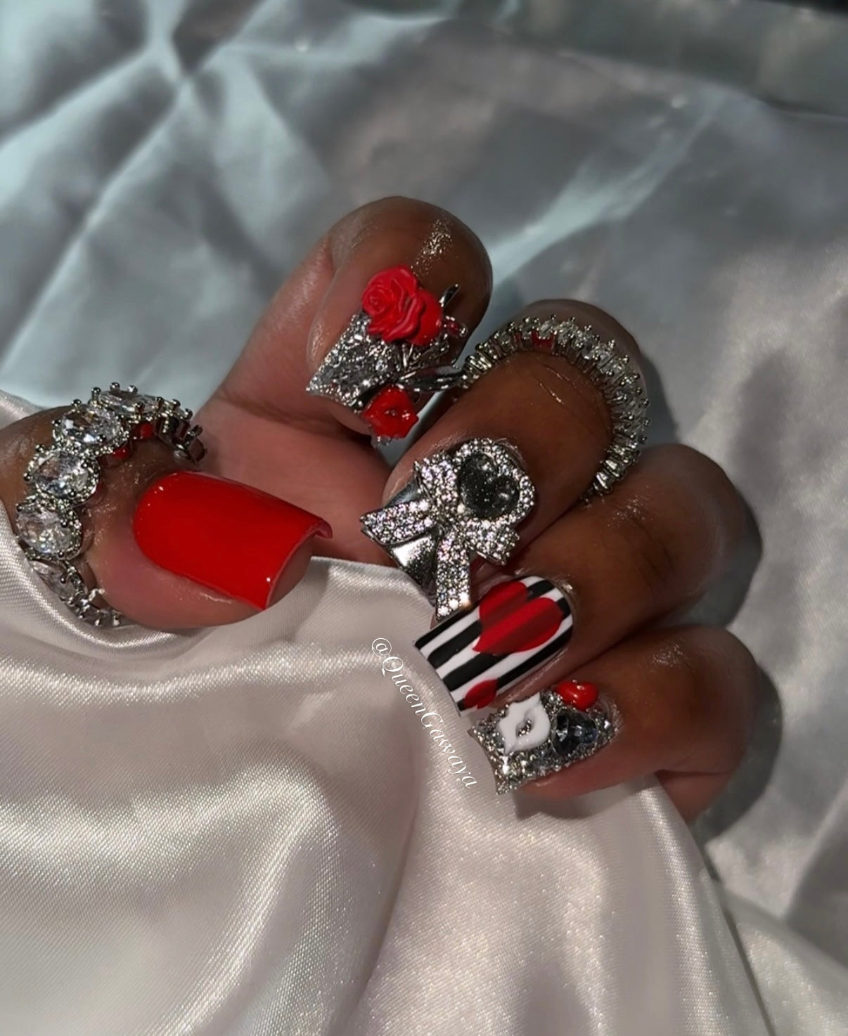 Fall hard and unapologetically. Love Addict is a bold, high-glam press-on nail set designed for the ones who crave attention and aren’t afraid of obsession. Featuring seductive red tones, sparkling diamond accents, flirty hearts, bows, and rose details, this set delivers pure luxury with a dangerously sexy edge.