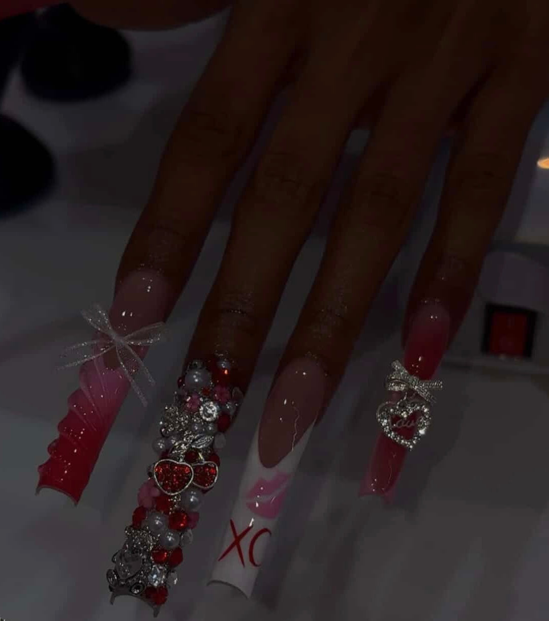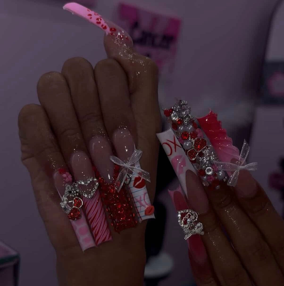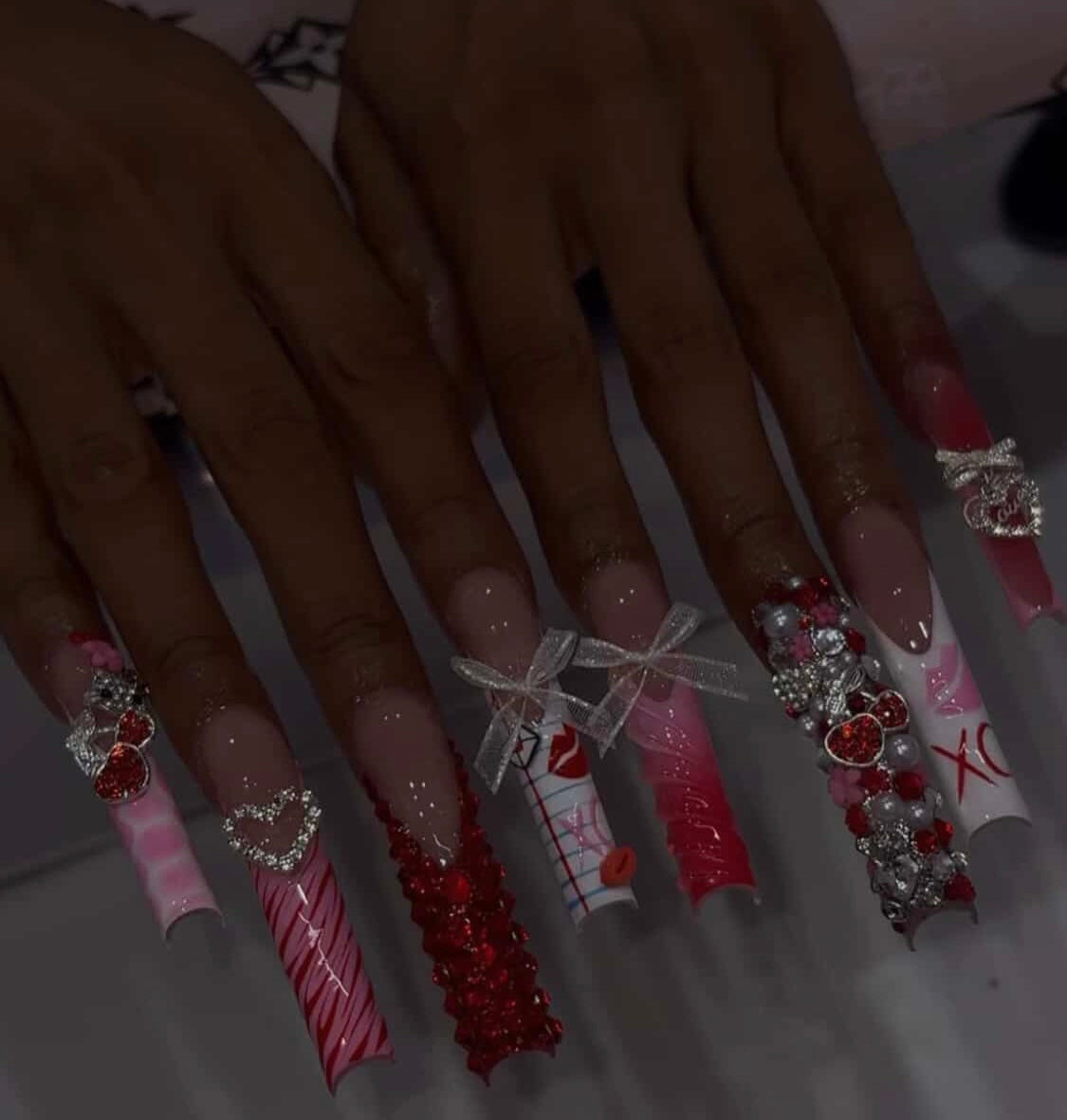 Valentina Royale is the definition of luxury romance. This statement press-on nail set features soft blush and bold red tones, hand-placed crystal embellishments, delicate bows, and royal crown accents that drip in elegance. Every nail is handcrafted to embody femininity, confidence, and pure royalty.